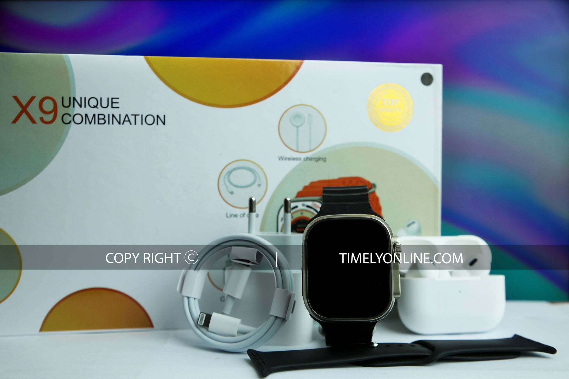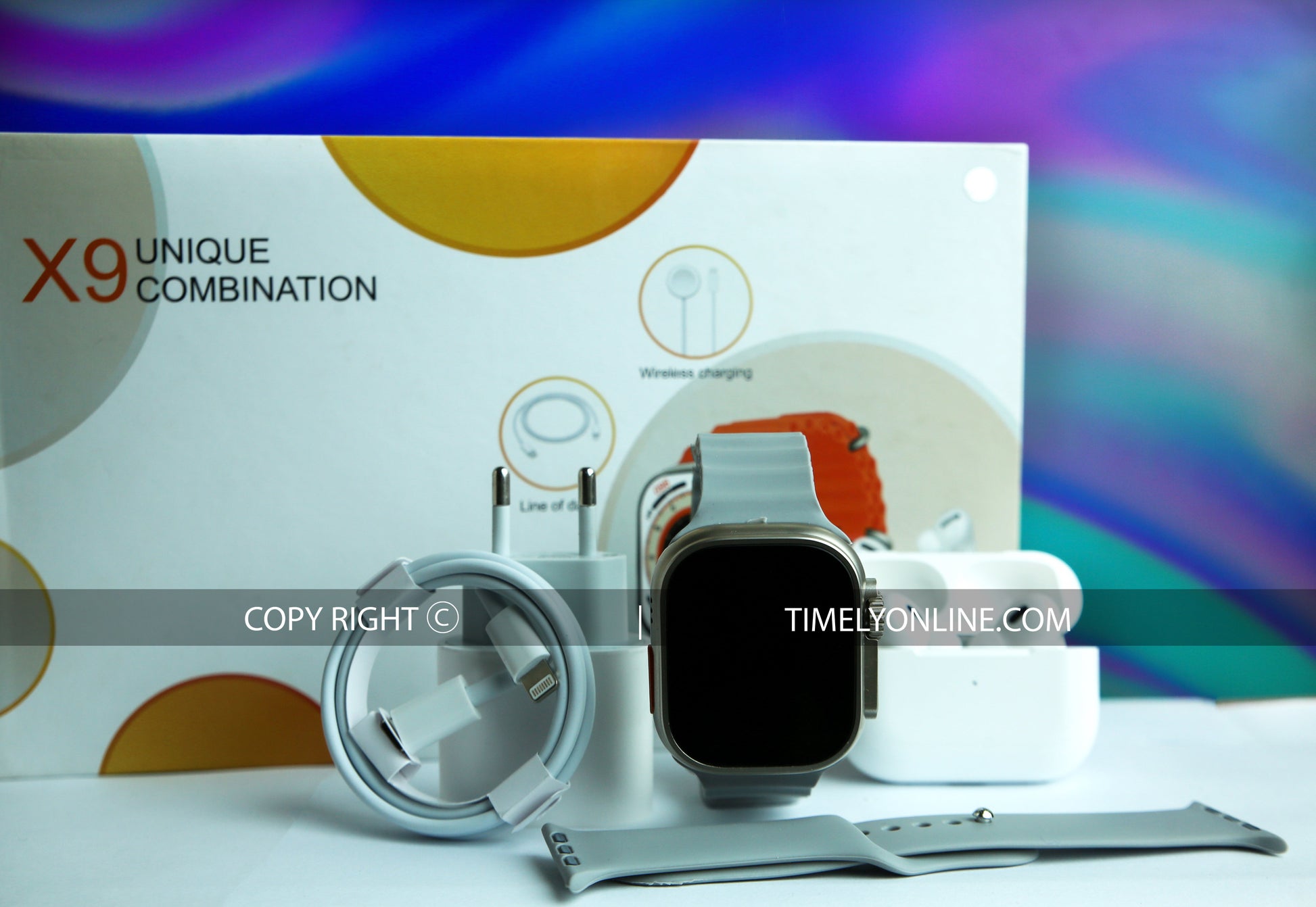 Introducing the X9 Smartwatch, a distinctive combination of elegance and functionality that seamlessly integrates features from the Series 8, Watch Ultra, and AirPods Pro 2. With a luxurious Ocean Strap, versatile Silicone Strap, and the convenience of a wireless charger for both your watch and AirPods or phone, the X9 is designed to elevate your lifestyle.